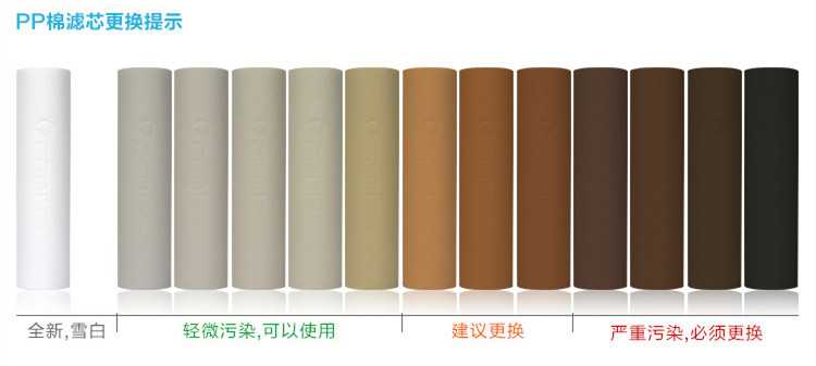 家用RO凈水機一共五層過濾分別為:5微米PP棉、顆粒活性炭、1微米PP棉、RO膜和小型T33。一般情況下,RO膜和小型T33是不需要經(jīng)常更換的,它們的更換周期大約在1~2年,使用壽命較長。而前三個濾芯需要更換的相對頻繁一點,以保證不影響RO凈水機的產(chǎn)水量和凈化效果。而PP棉的更換時間一般在兩個月左右,具體的更換條件見下圖。 而顆?;钚蕴康母鼡Q周期一般比PP棉相對長一點。一般為三個月左右。所以很多用戶為了避免麻煩,就在兩個月更換PP棉的時候直接就把顆?;钚蕴康臑V芯一起更換了,這樣也都是可以的。 所以根據(jù)我們這么多用戶更換濾芯的反饋,一臺RO凈水機在一般的三口之家使用,更換濾芯的周期為2~3個月之間。更換RO膜和T33的周期為2年左右。